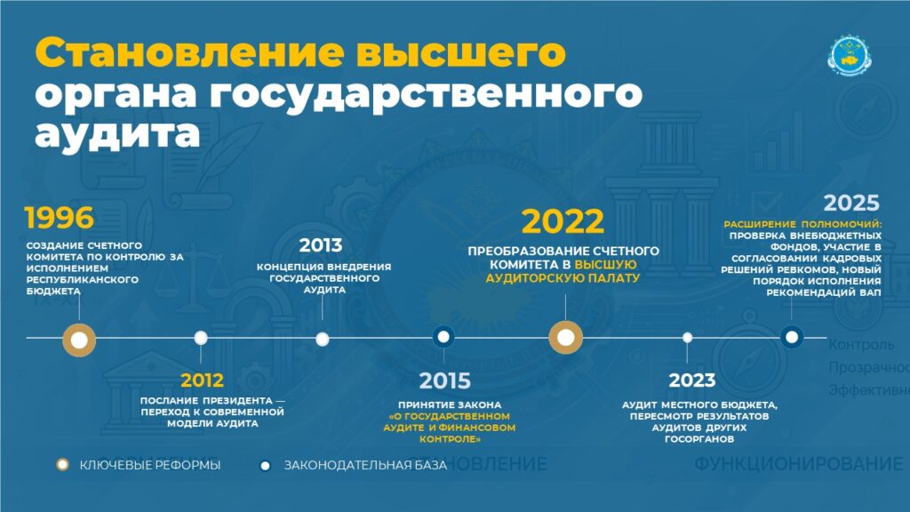 По поручению Главы государства Касым-Жомарта Токаева в 2022 году Счетный комитет был преобразован в Высшую аудиторскую палату. Это был стратегический шаг, существенно расширивший полномочия ВАП.